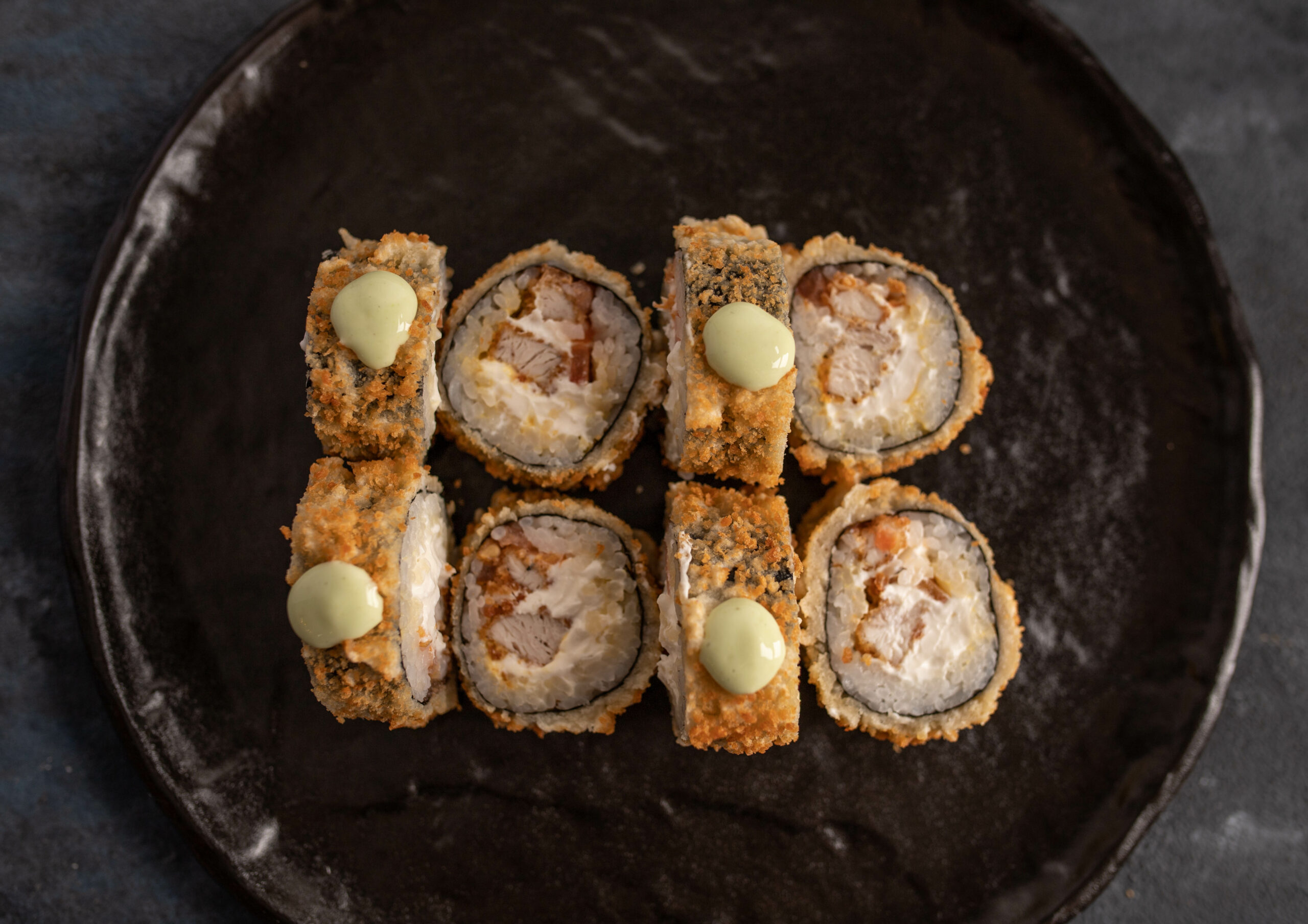 Куриное филе темпура, сливочный сыр, томат, соус васаби.
