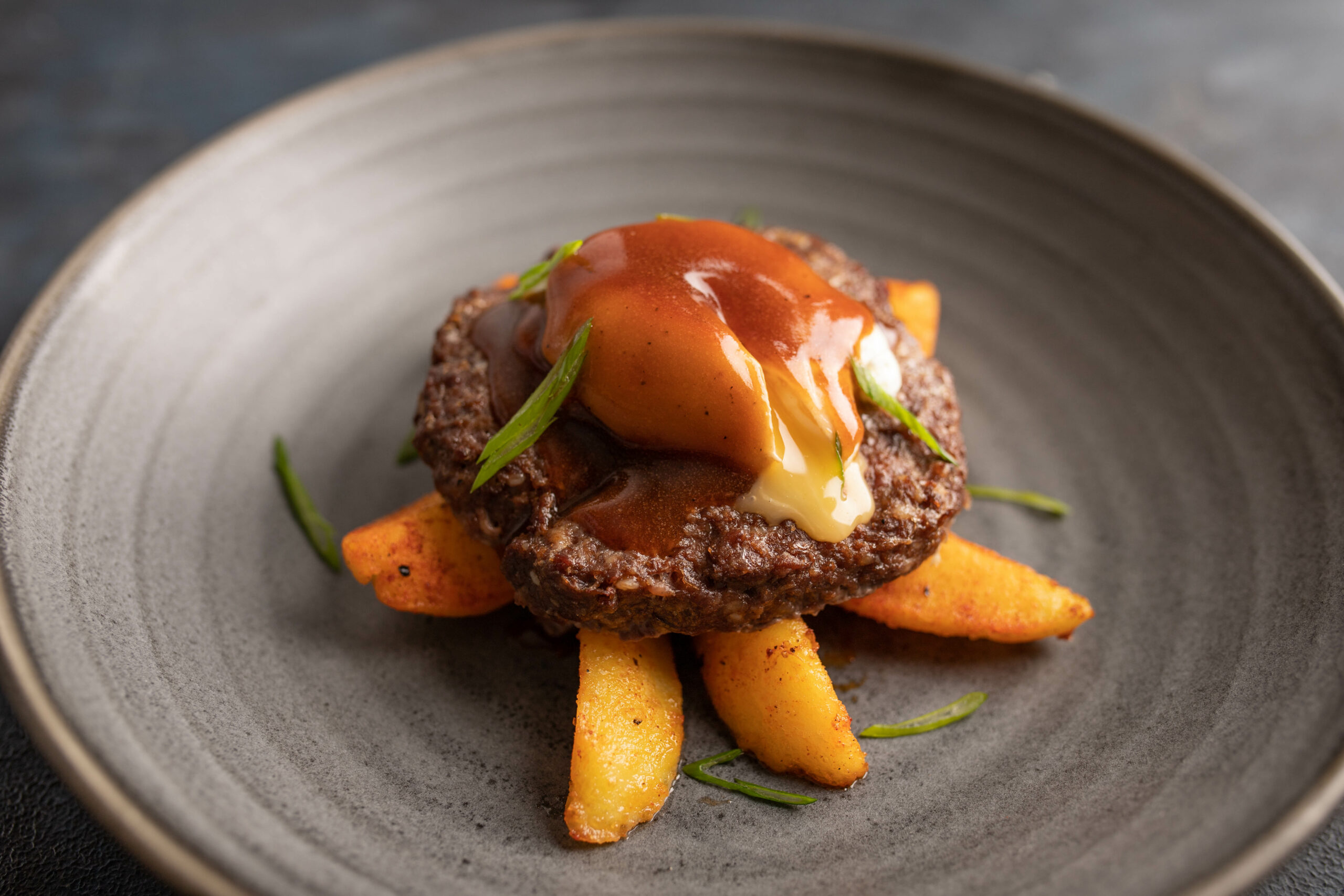 Котлета из фермерской говядины, картофельные дольки, лук зеленый, соус демигляс, чесночное масло, яйцо пашот.