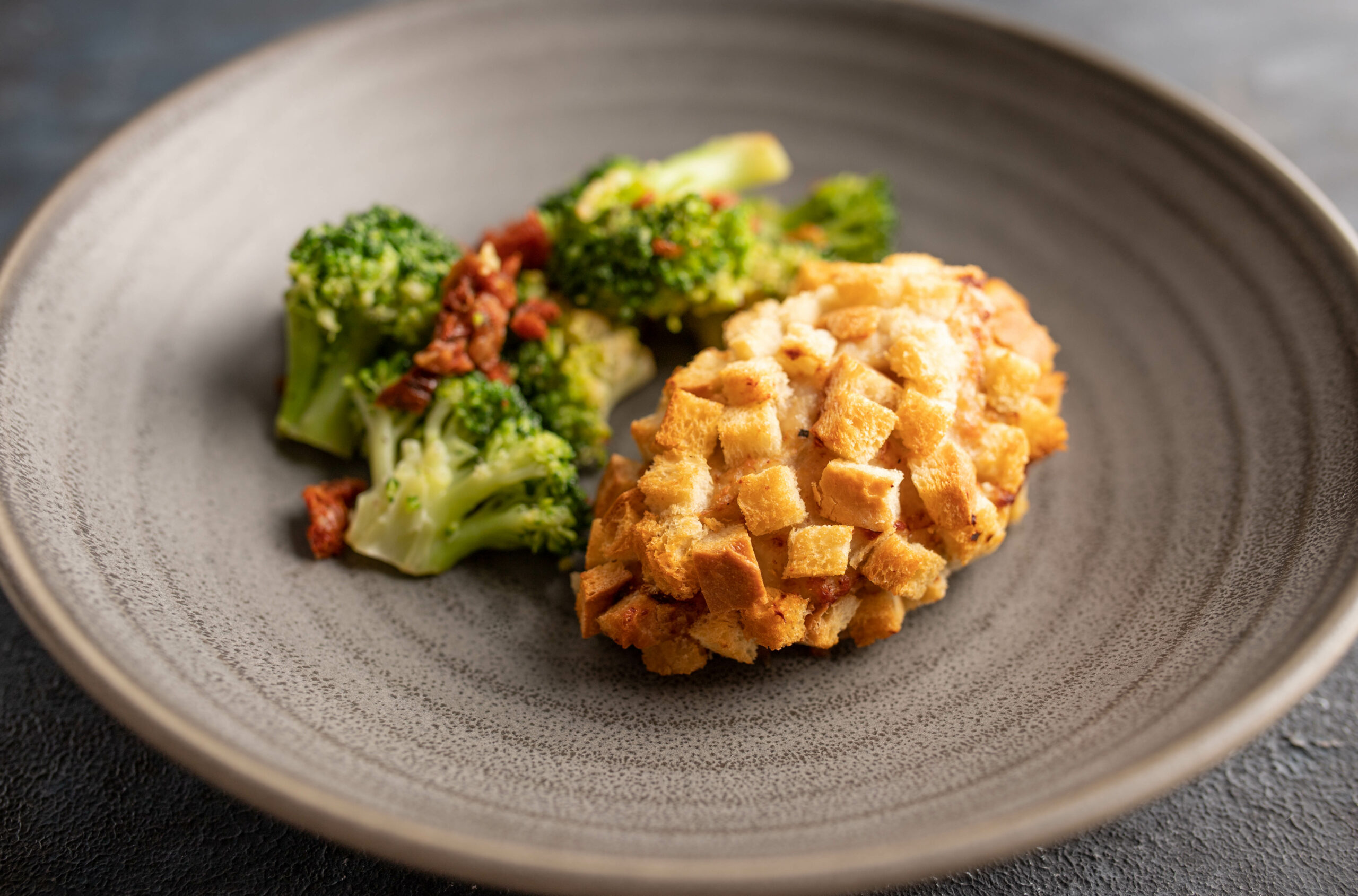Рубленая котлета из курицы в панировке, вяленые томаты, брокколи