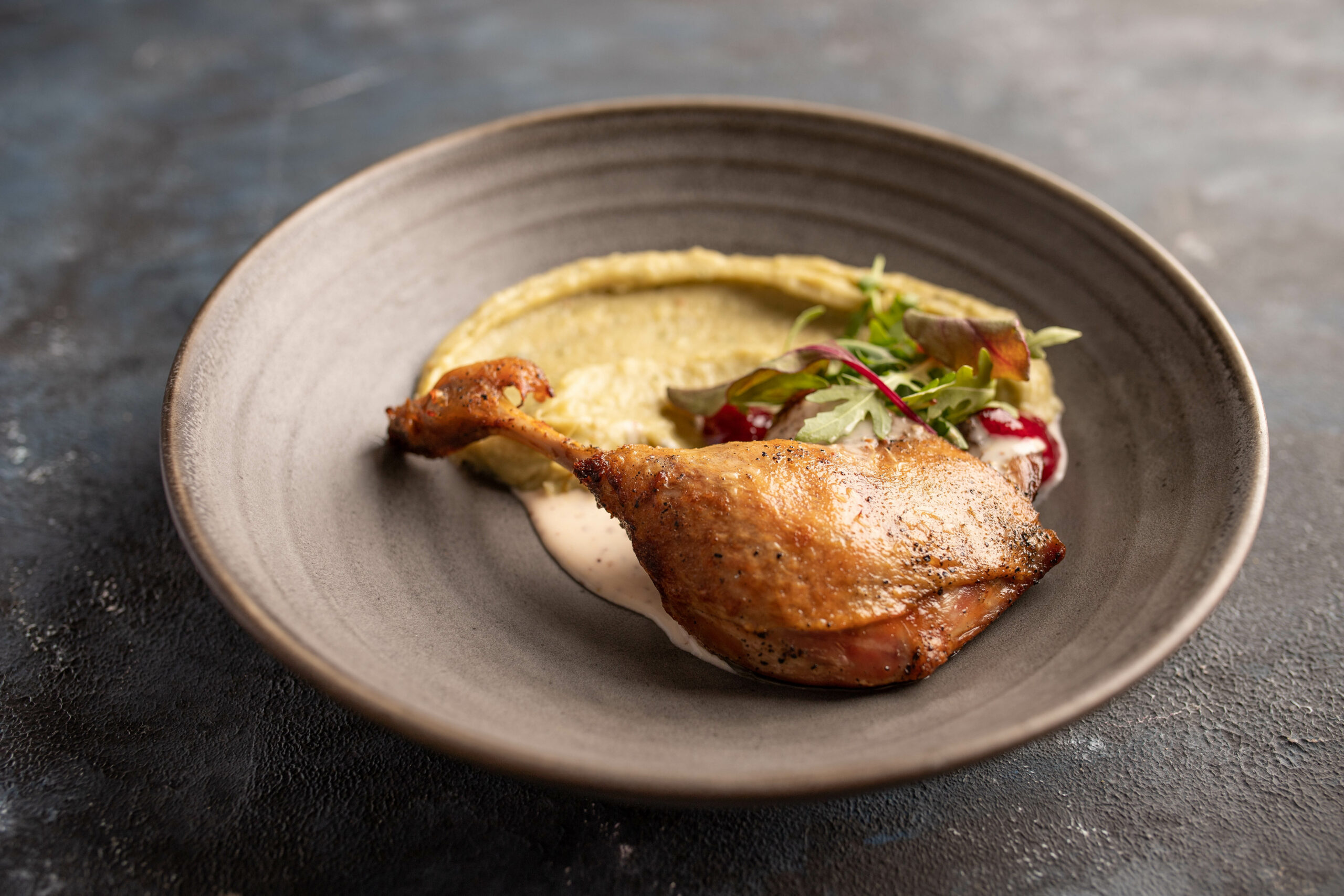 Утиная ножка в традиционном исполнении, с ягодным и сливочно-горчичном соусом, зеленое пюре., микс салата