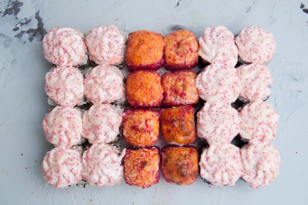 Креветка, угорь, снежный краб, окунь, икра масаго, сыр сливочный, огурец, соус спайси